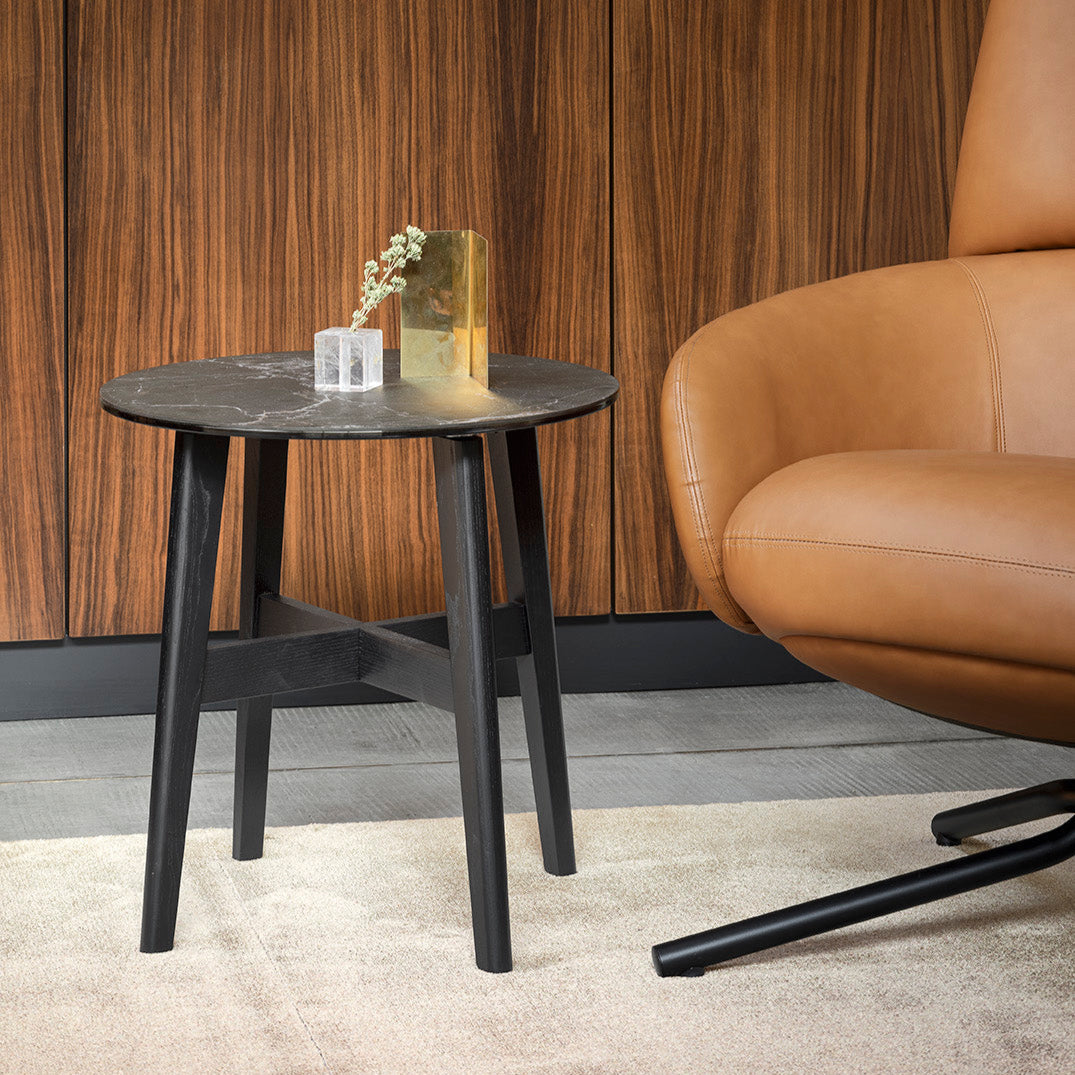 ABREY Sidebord er et elegant og bord med en sokkel i massiv ask. Elegansen til dette bordet ligger i en ren enkel design, som fremhever den sjeldne skjønnheten til toppene som er i forskjellige materialer . De flotte bena er i heltre ask med utførelsene matt svart, smoke eller valnøtt, disse valgene går igjen i bordplate eller velg mellom keramiske topp i hvit marmor, svart calacatta, Calacatta paonazzo eller bronze .