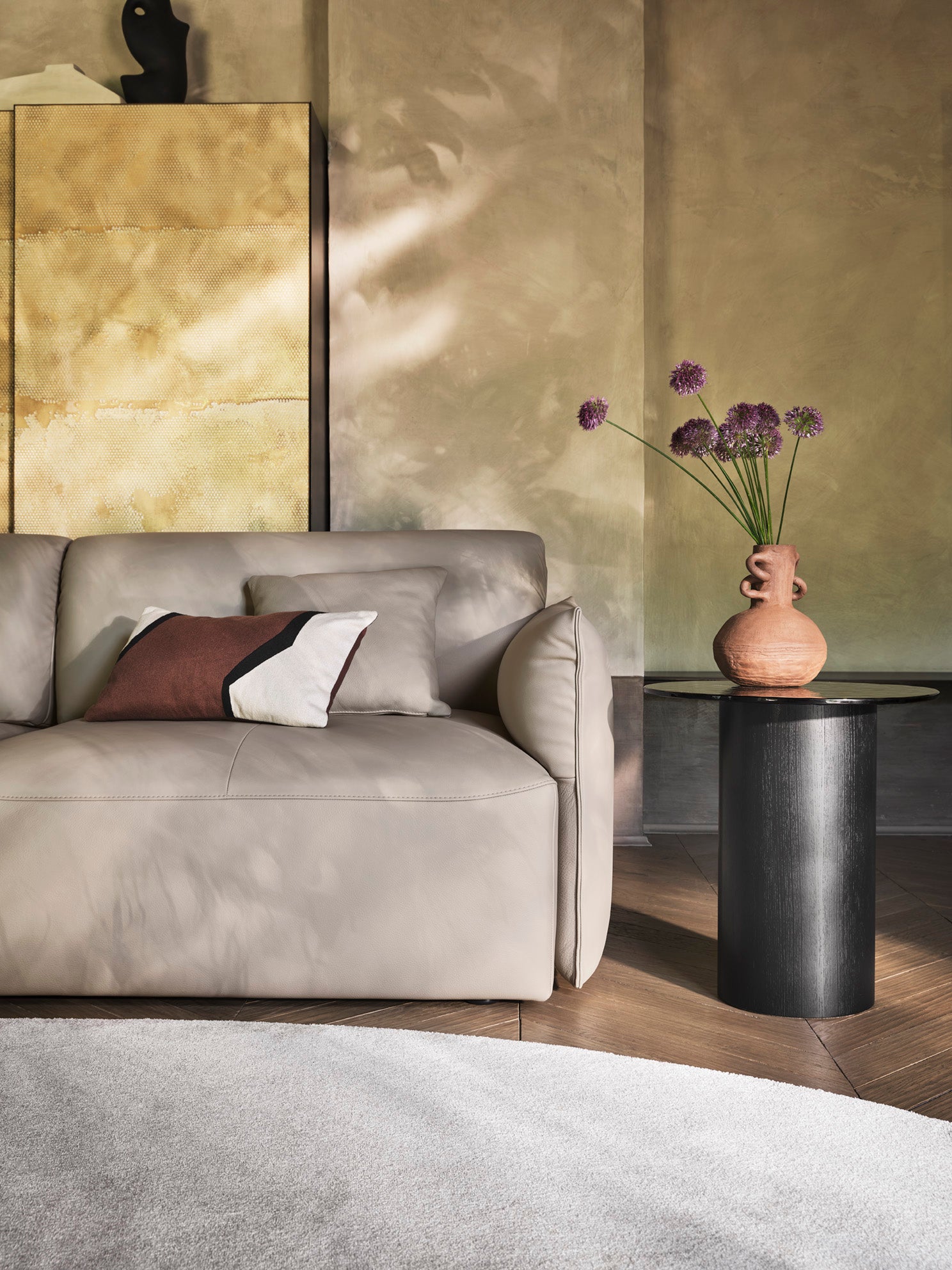 Den varianten har en komfortabel endemodul i form av en chaise longue – perfekt for å strekke ut bena eller skape en mer uformell sone i stuen. Den naturlige tekstilen understreker sofaens taktile kvalitet og gjør den lett å kombinere med både varme naturmaterialer og moderne interiør. Pris gjelder for sofaen i priskategori 2.