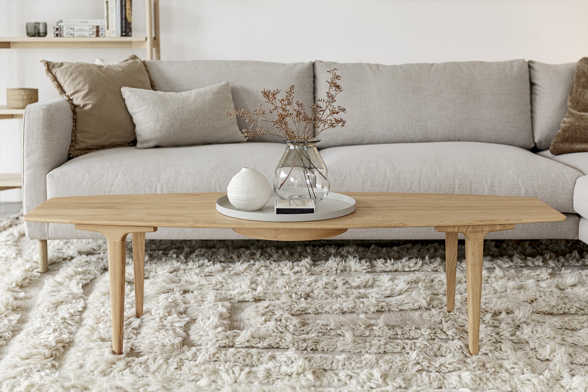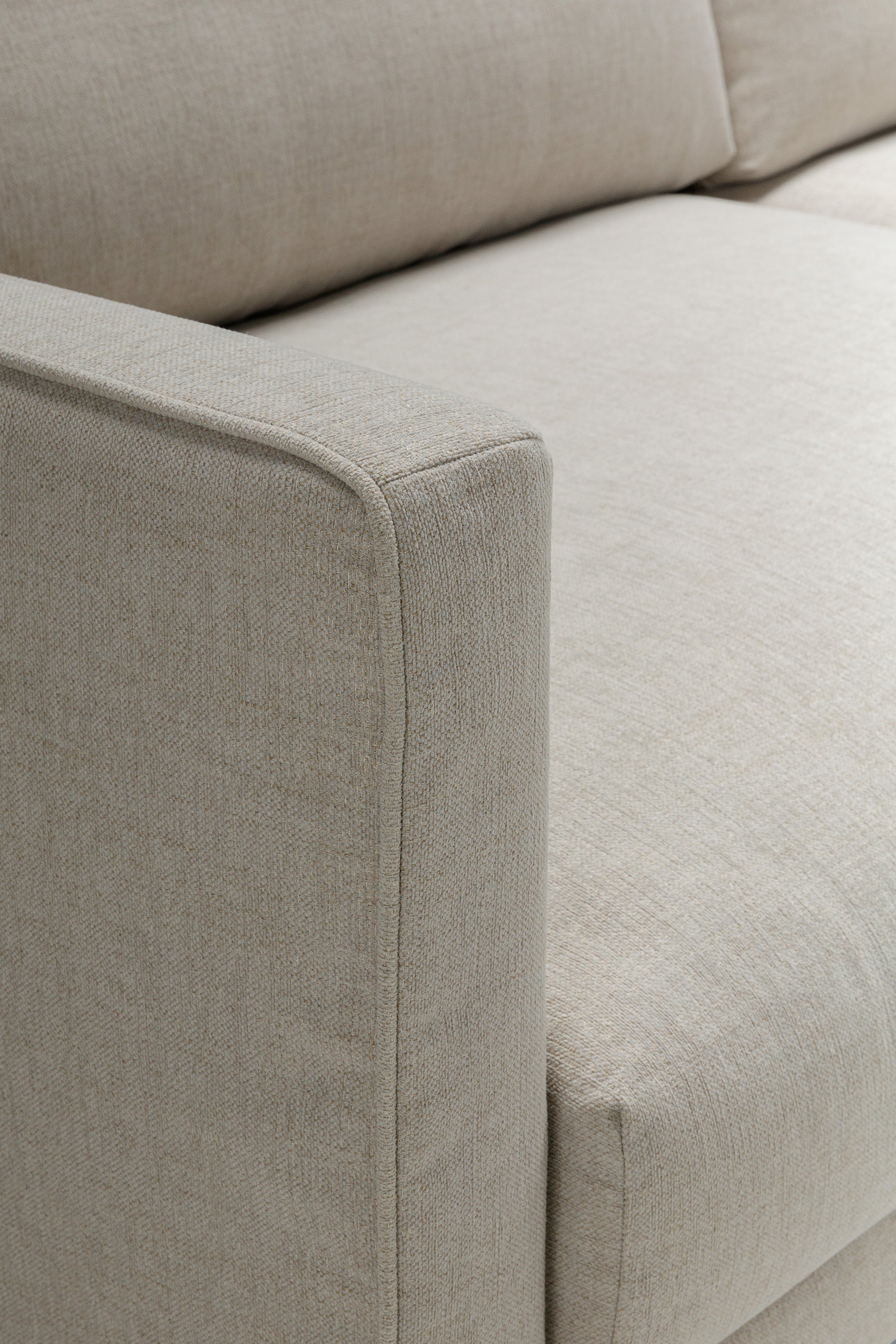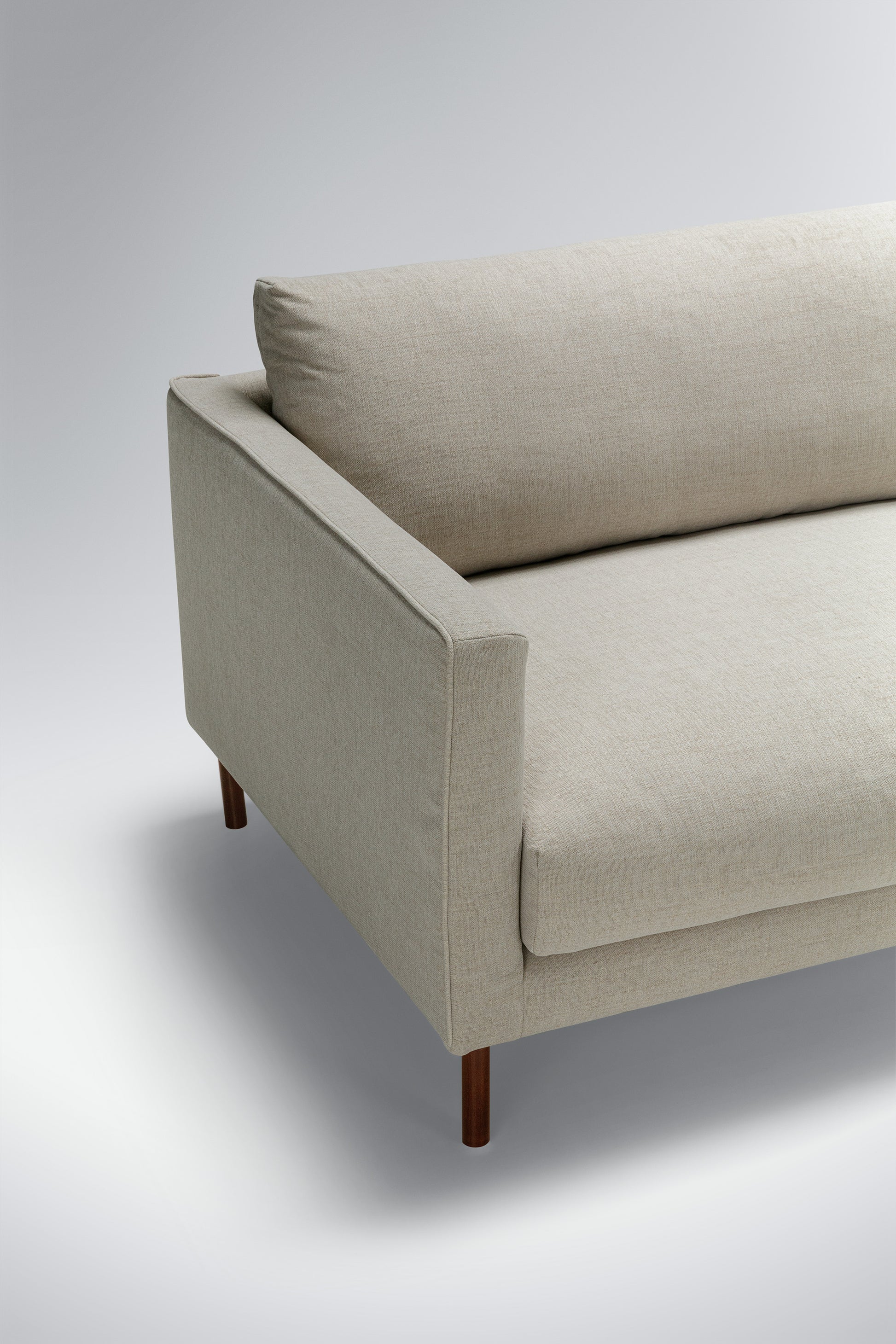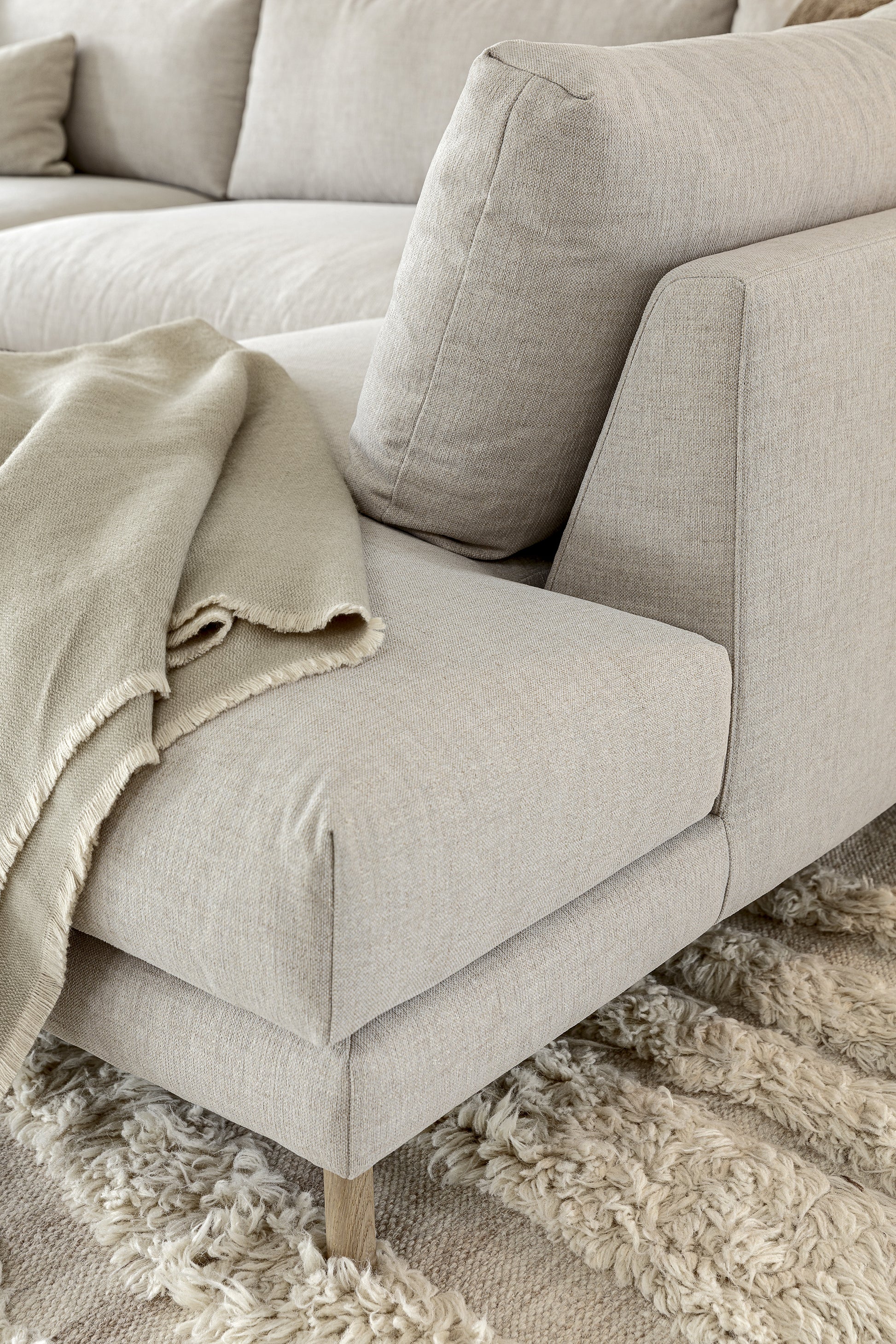 Avbildet sofa er Trukket i det myke og elegante stoffet Timber 1. light beige og løftet av slanke, eik treben – en kombinasjon som gir et moderne og sofistikert uttrykk. Timber tekstilet er i prisgruppe 3, og tekstilet er avtagbart.