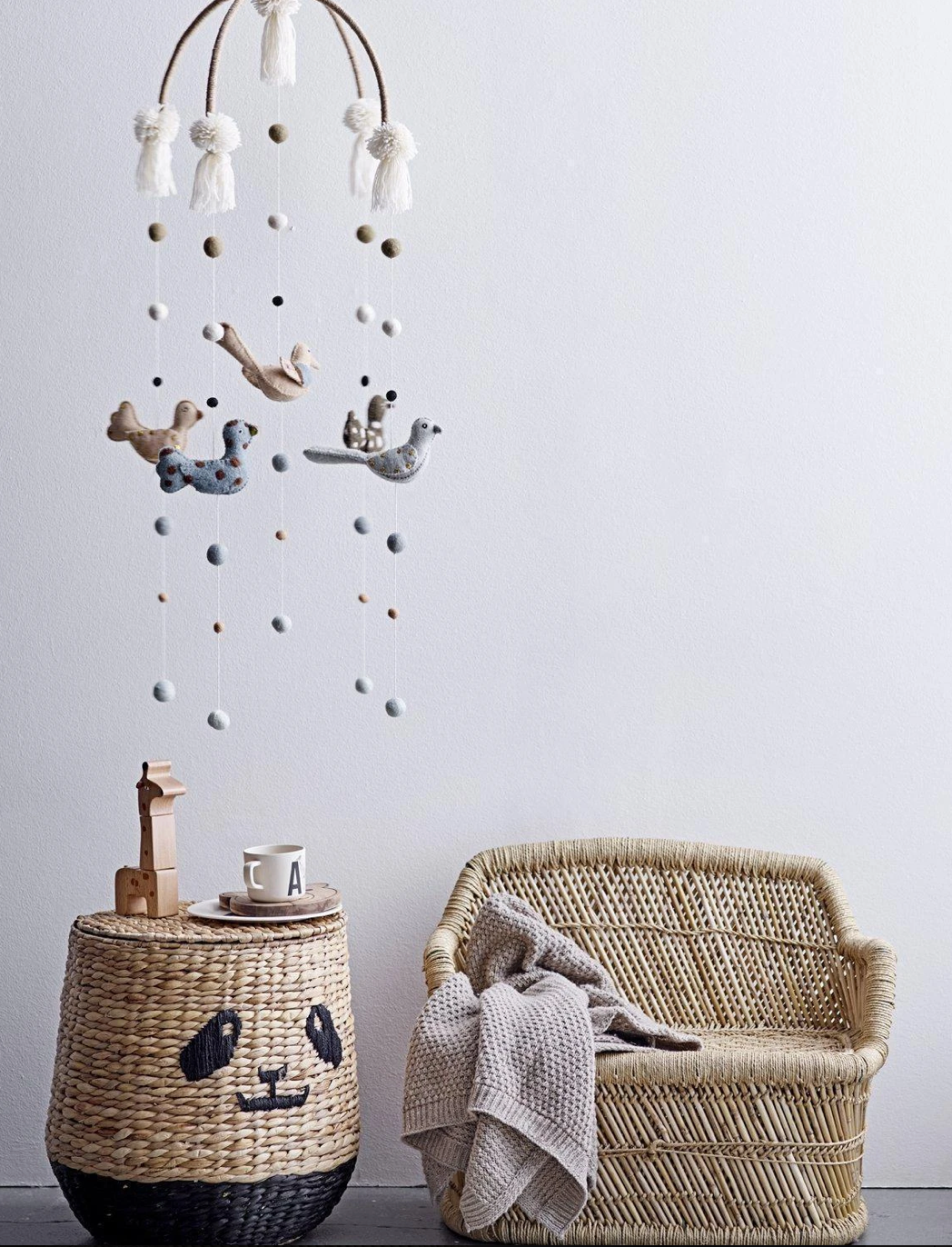 Lag et fargerikt og magisk barnerom med Baby Birdie Mobile laget av naturlige ullfibre og prydet med tovede fugler og dusker.