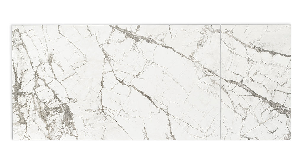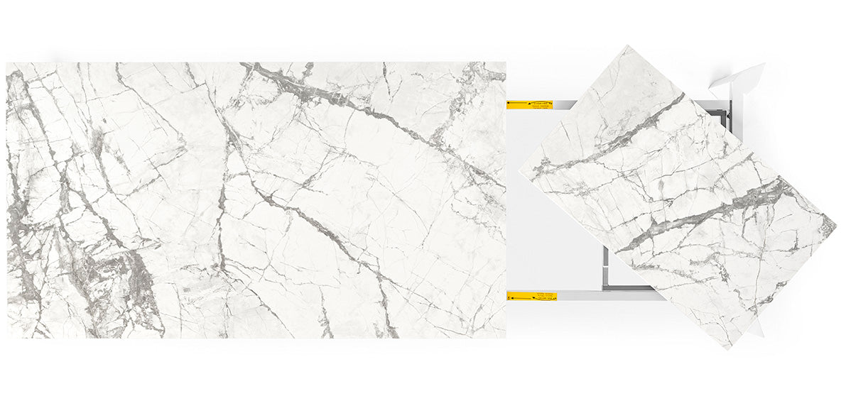 Bordet kommer i 3 størrelser, alle med uttrekk i enden. Det er samme materiale i utrekket som i bordplaten, og mønsteret er sammenhengende. Hovedbilde har ben i matt pretl beige og topp i p36 Dolomite keramsik topp. Stolen heter Fay og er en nyhet 2026, stolen har flex i ryggstøtten og avtagbart tekstil. Finn FAY HER