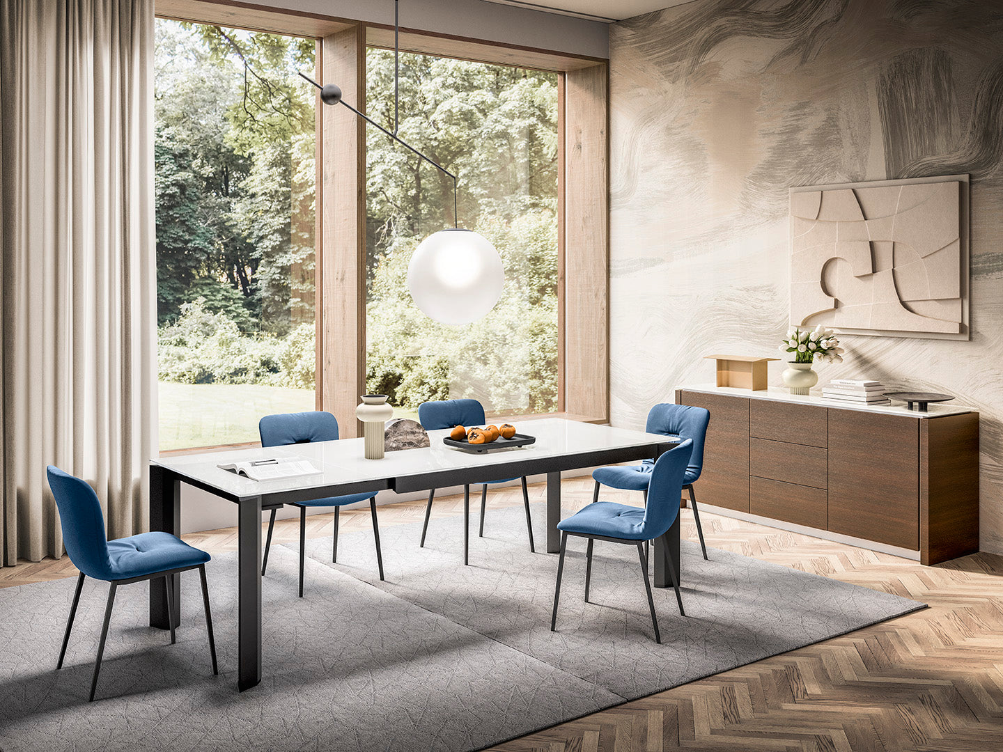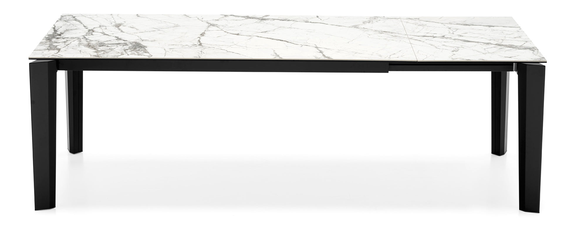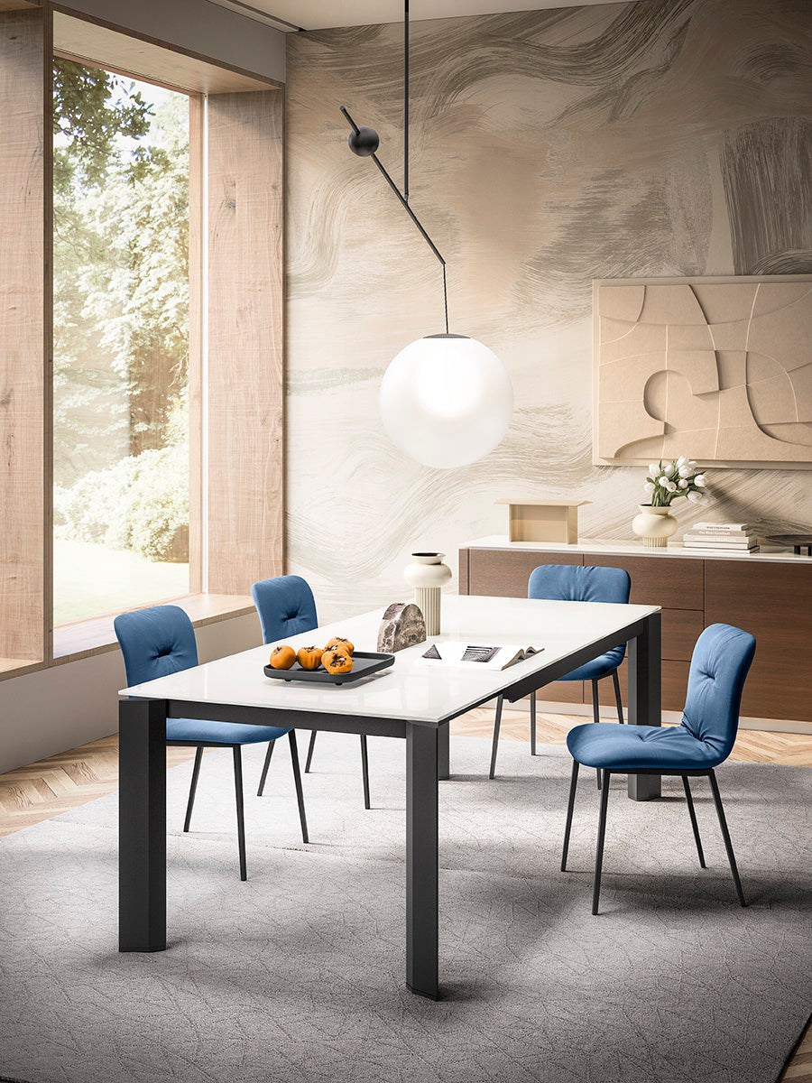DELTA spisebord med ilegg kombinerer funksjonalitet og design på en gjennomført måte. Bordet har karakteristiske metallben med skråskåret avslutning som gir et moderne og dynamisk uttrykk.