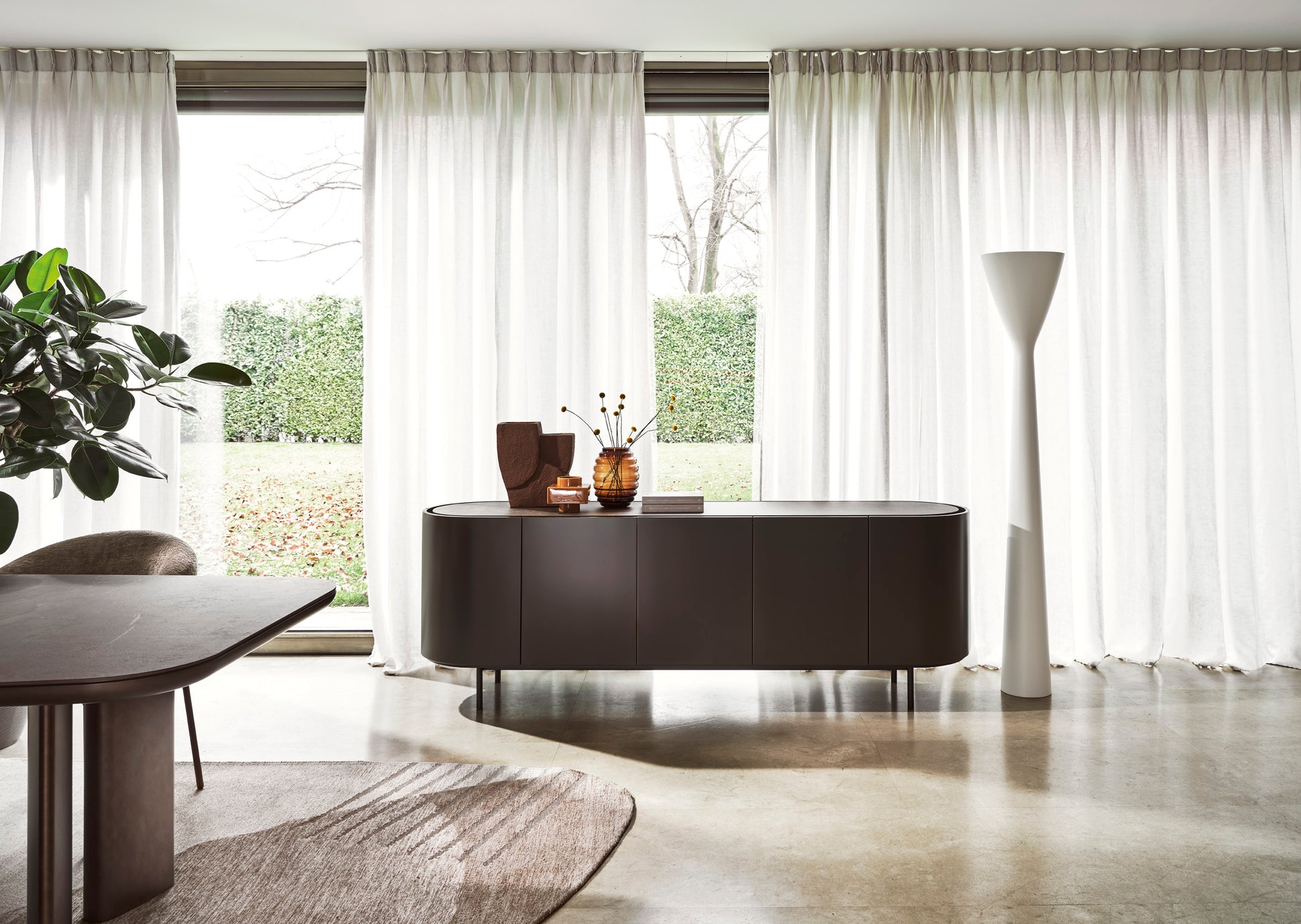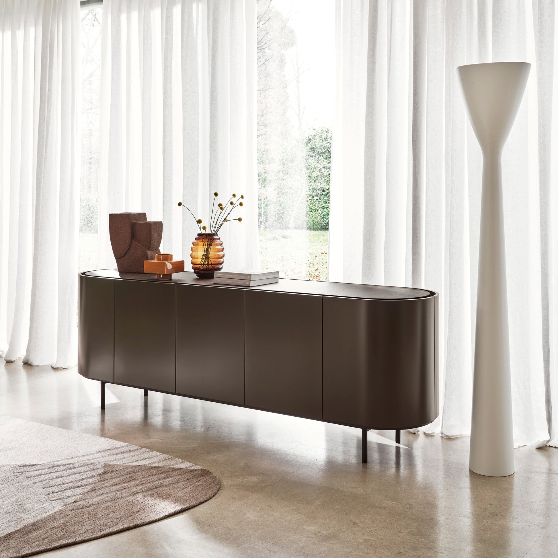 LAKE Bronze skjenk er et stuemøbel som skiller seg ut med sin slanke harmoniske design. På en forhøyet base har den en oval form, og skjønnheten forsterkes av den keramiske toppen som er litt tilbaketrukket fra kanten, og skaper et mellomrom mellom dør og topp som er nyttig for å åpne dørene og skuffene.