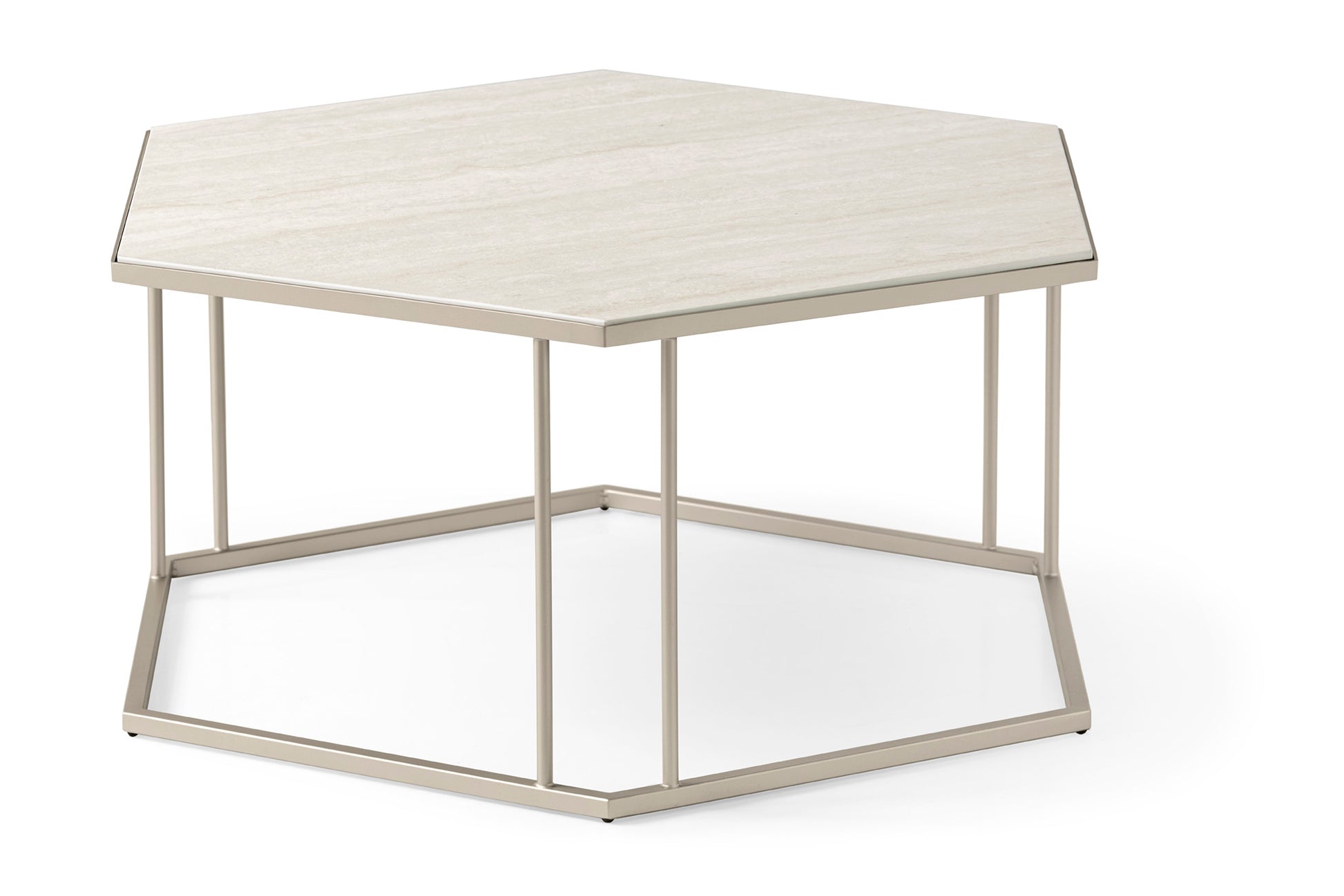 RENEE er en elegant serie salongbord tilgjengelig i flere geometriske former, størrelser og høyder. Bordene kommer med sekskantede eller kvadratiske bordplater, enten i speilglass med en dekorativ bølgeeffekt eller i keramikk – materialer som gir både karakter og eksklusivitet.