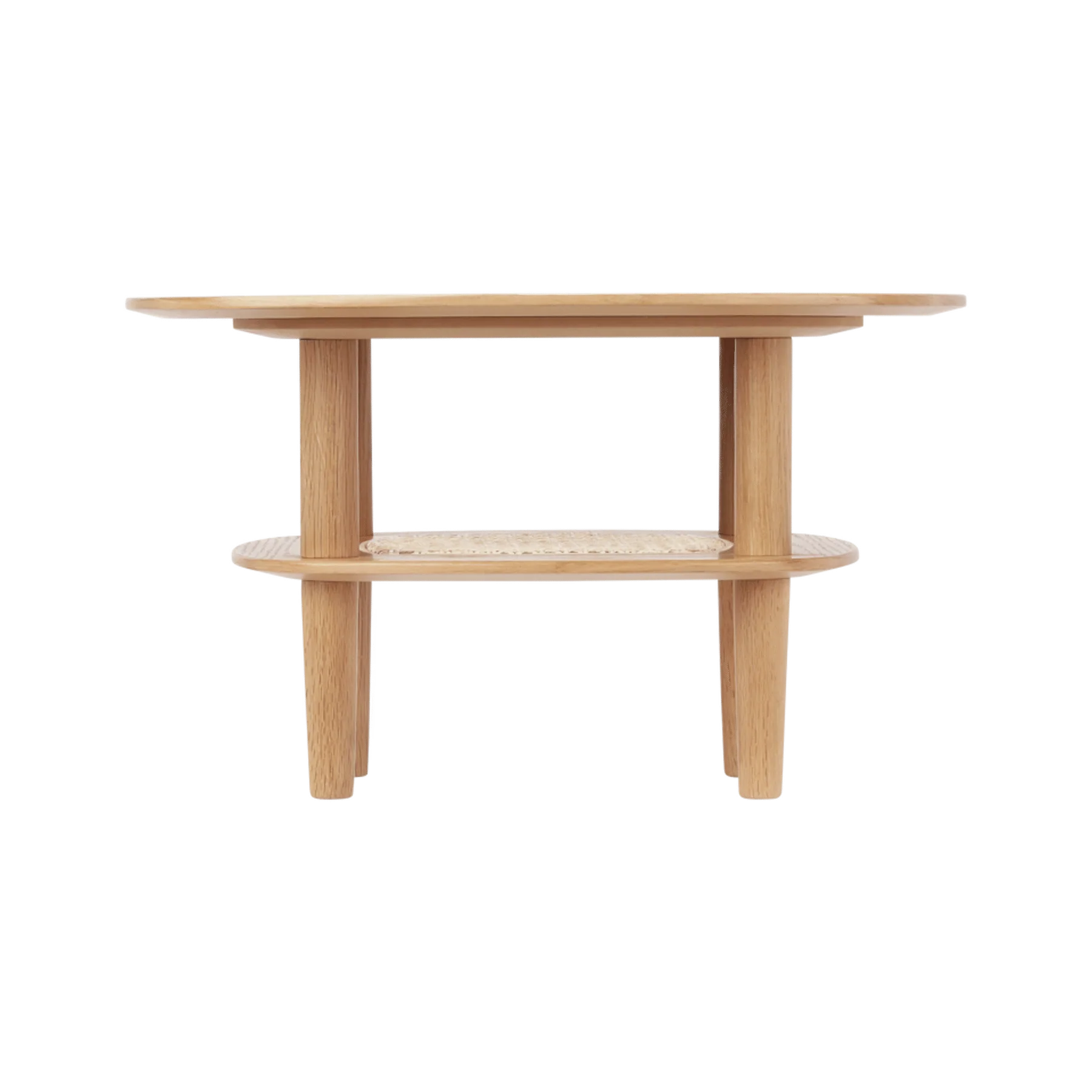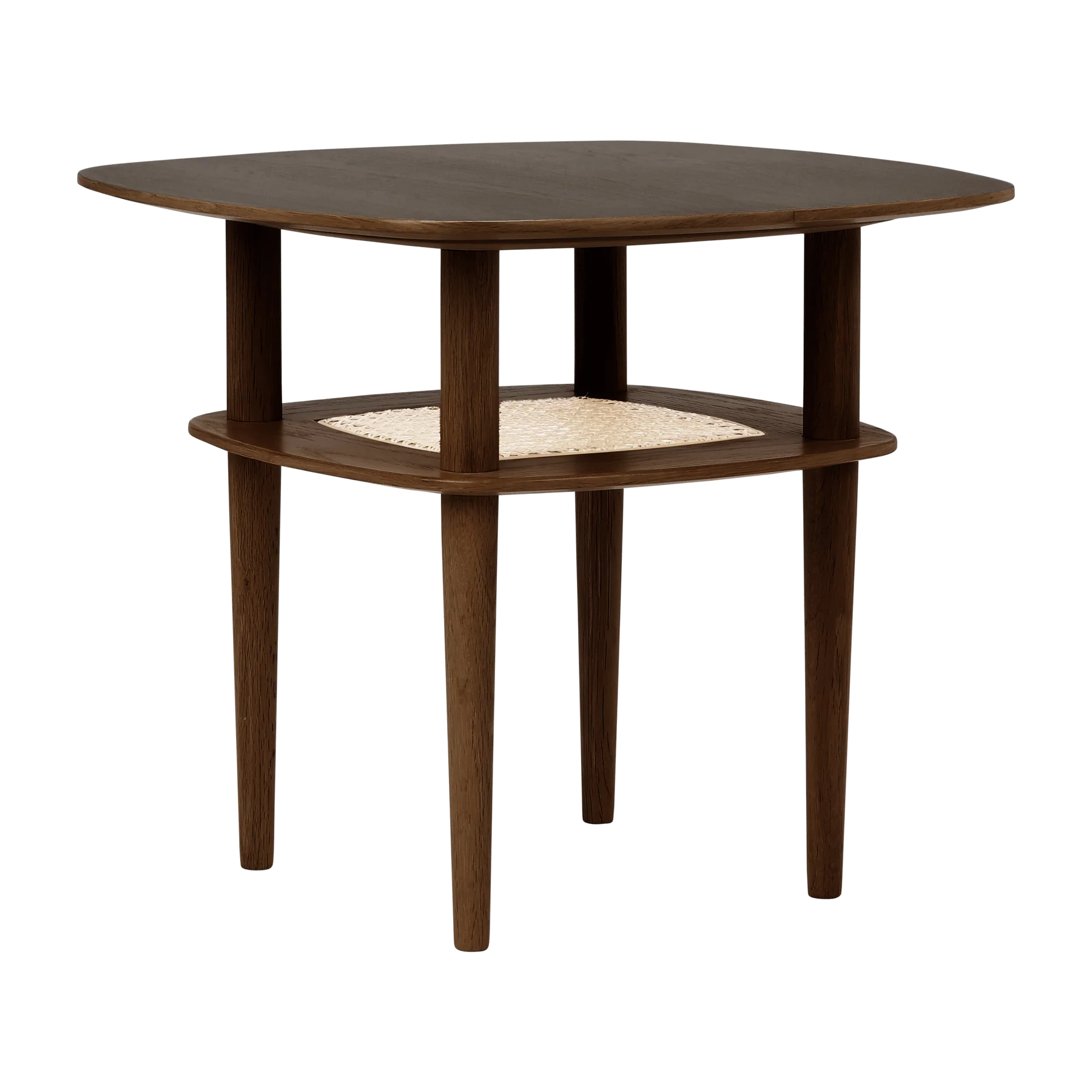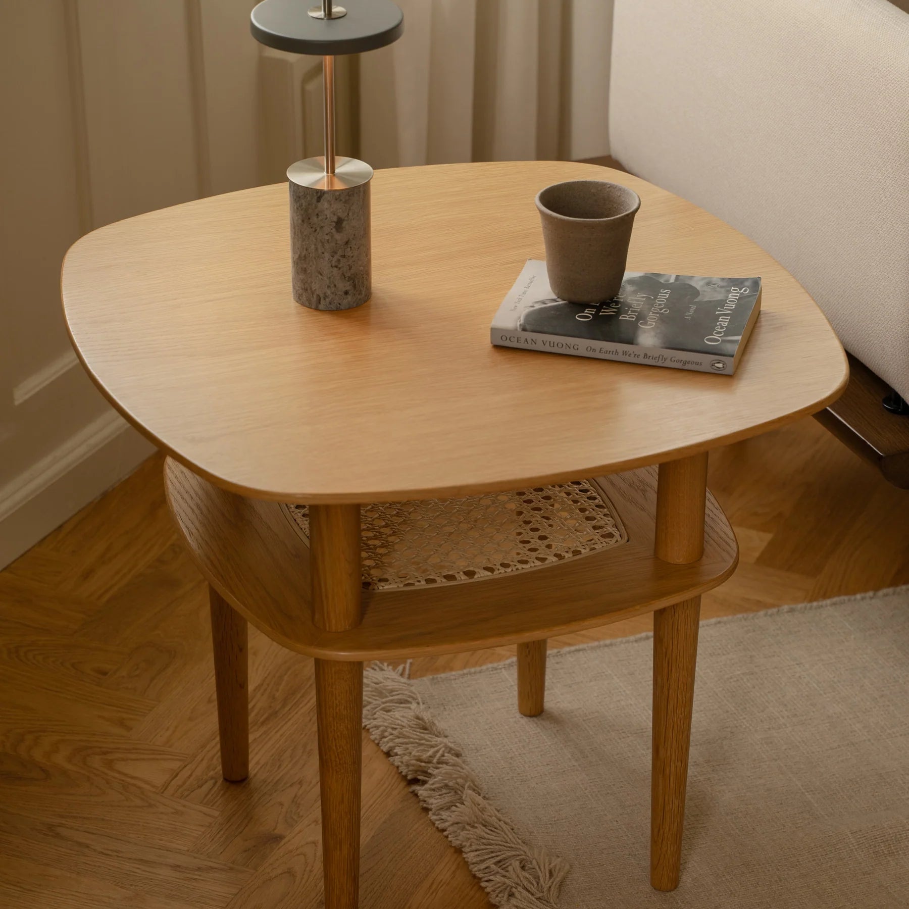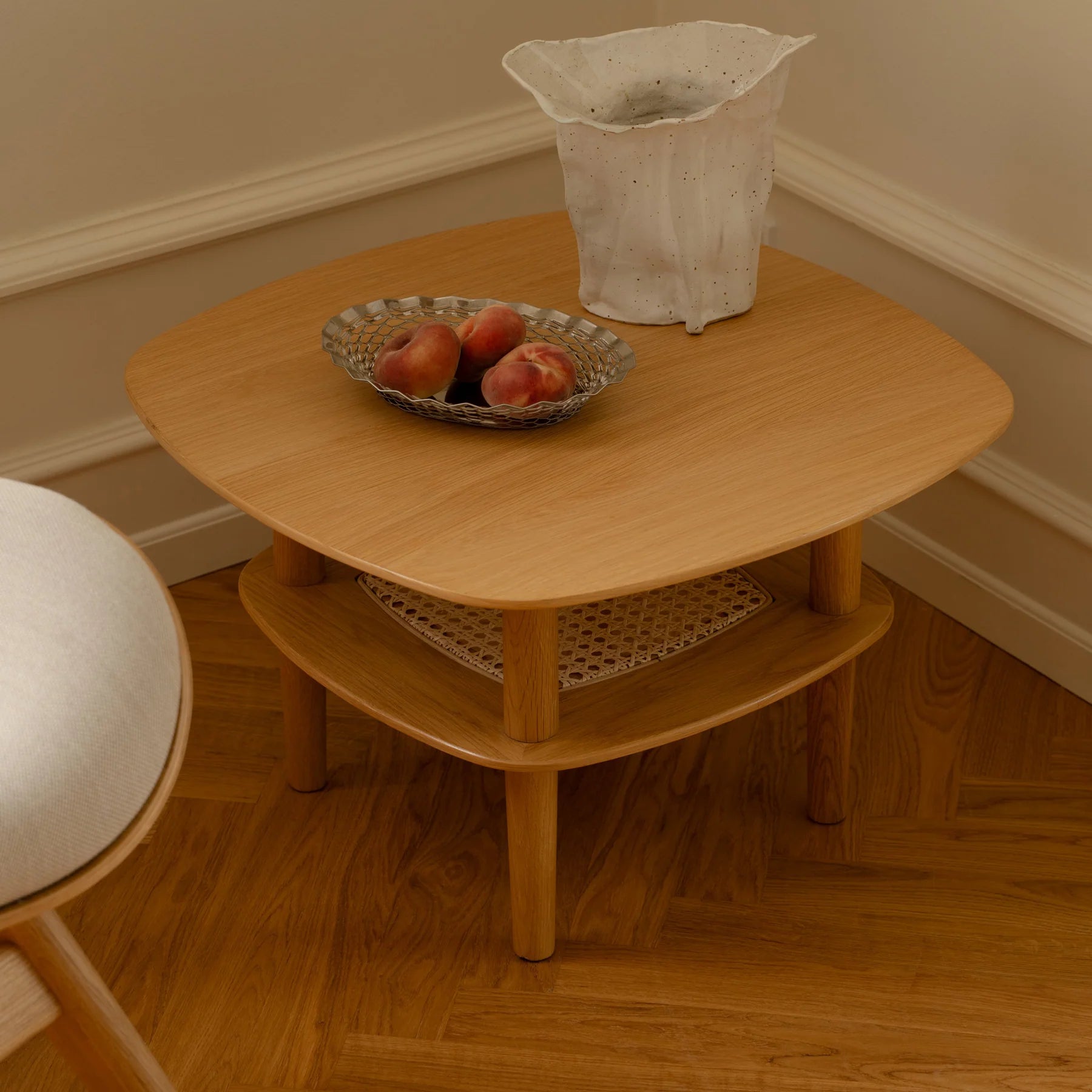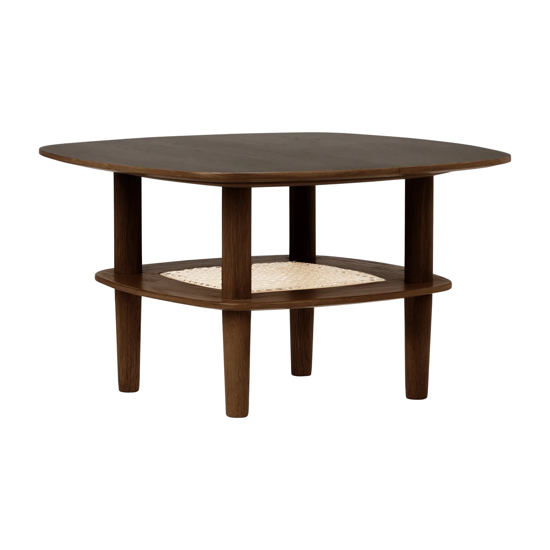 Together sofabord 60*60 cm er produsert i eik, med en hylle i rotting som gir et lett og luftig preg til designet. De avrundede hjørnene på bordet legger til et eksklusivitet uttrykk til designet. Bordets ben er trukket inn fra kanten av bordplaten - for sikkerheten til barn og tærne dine.