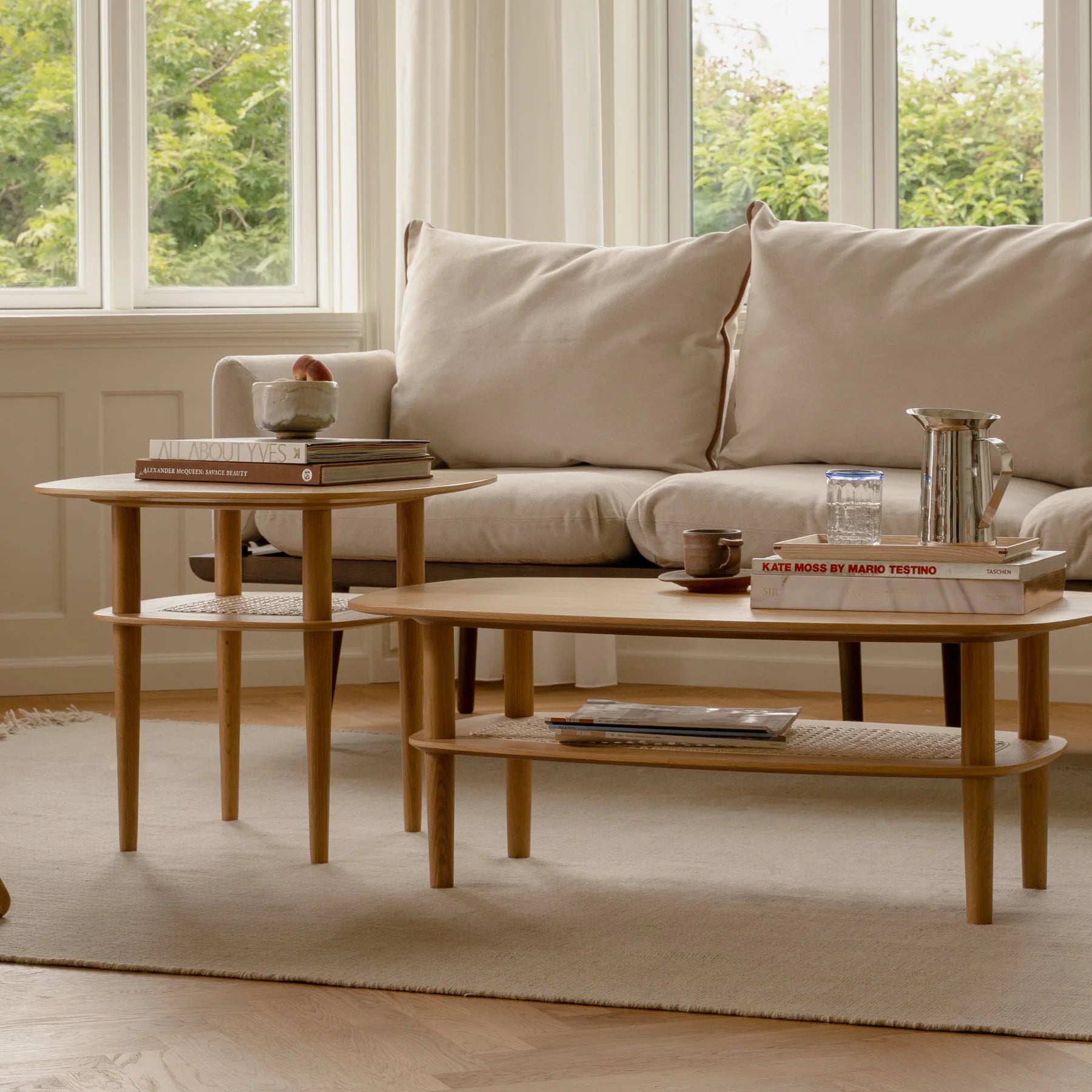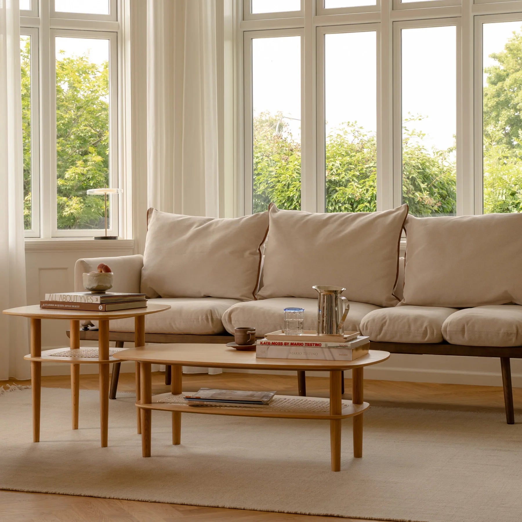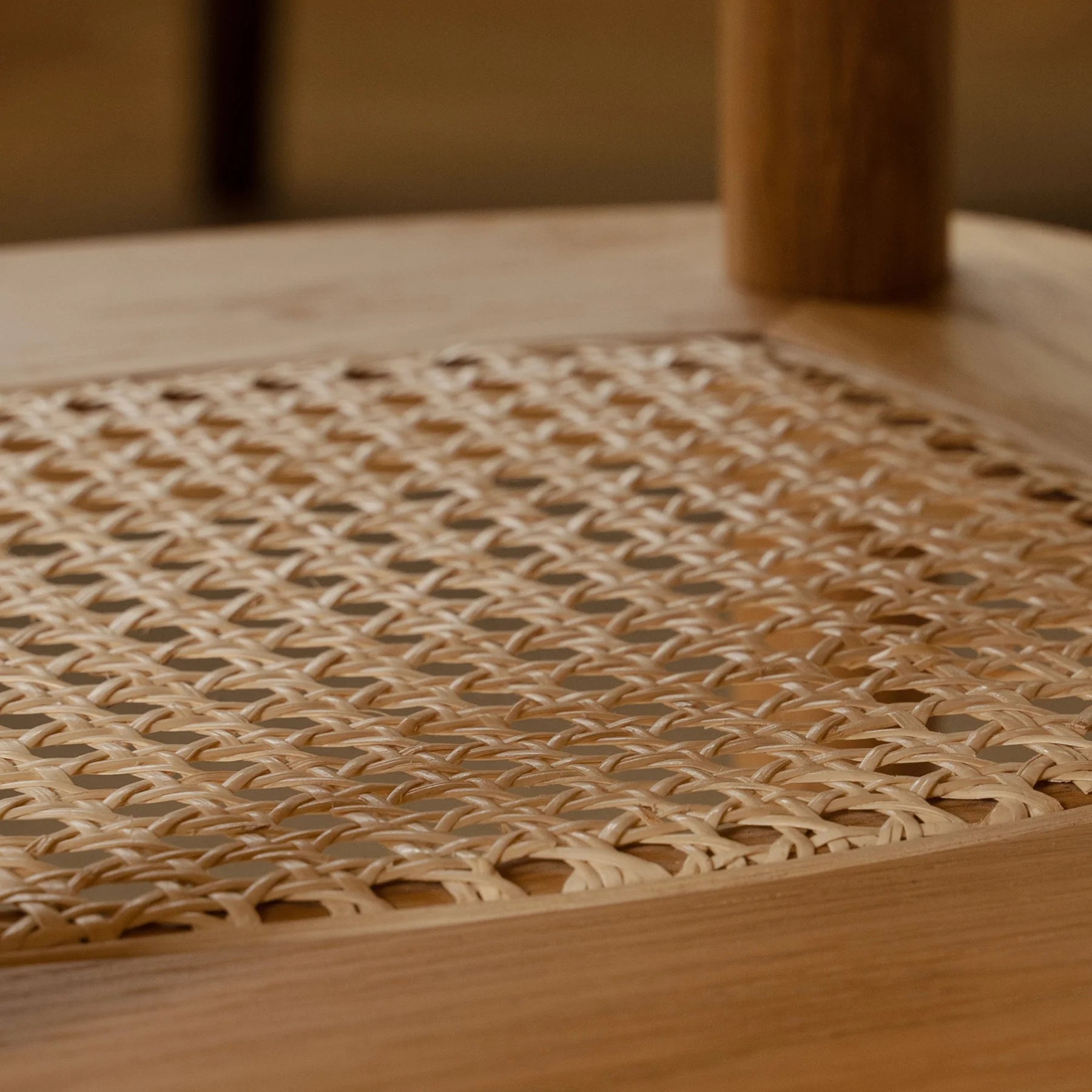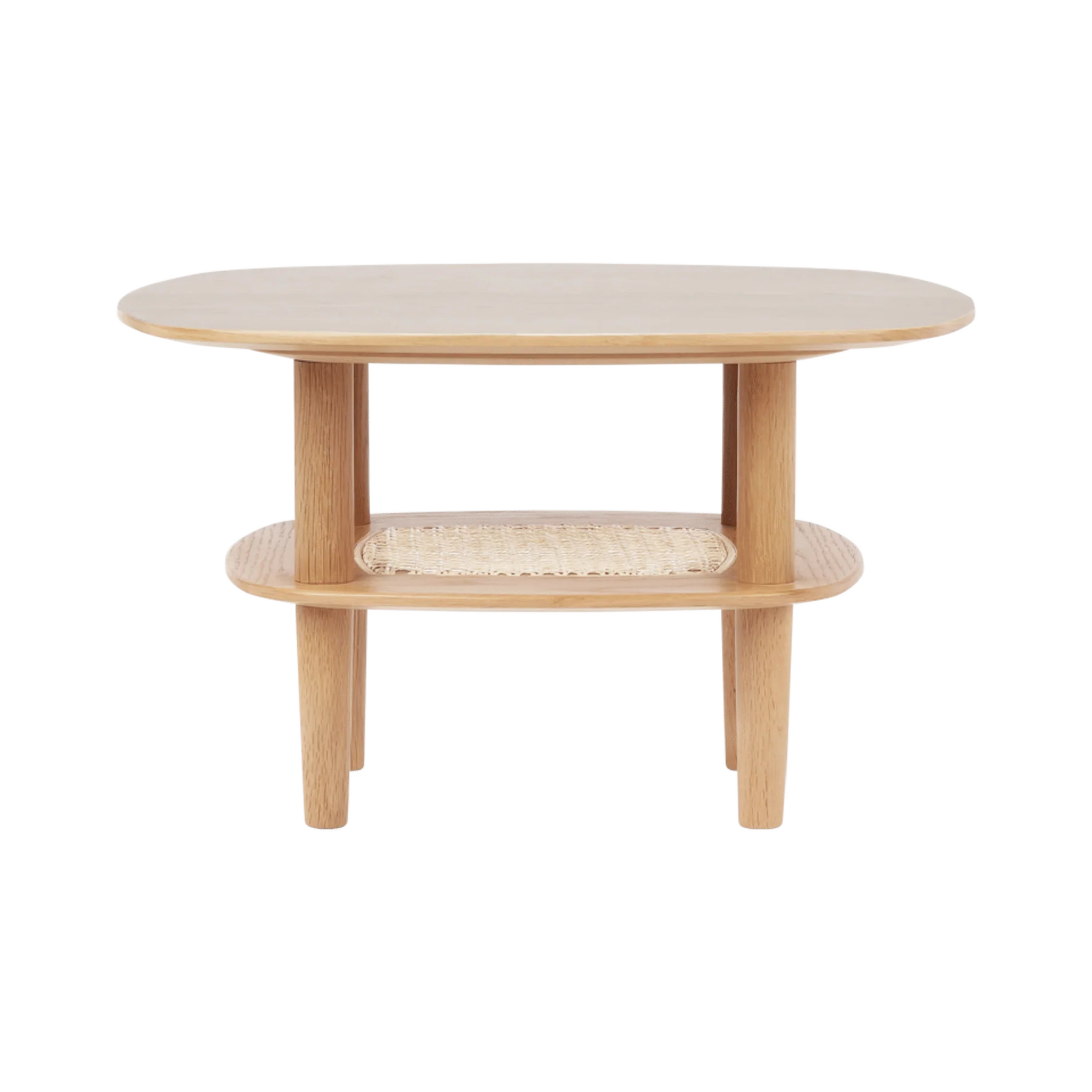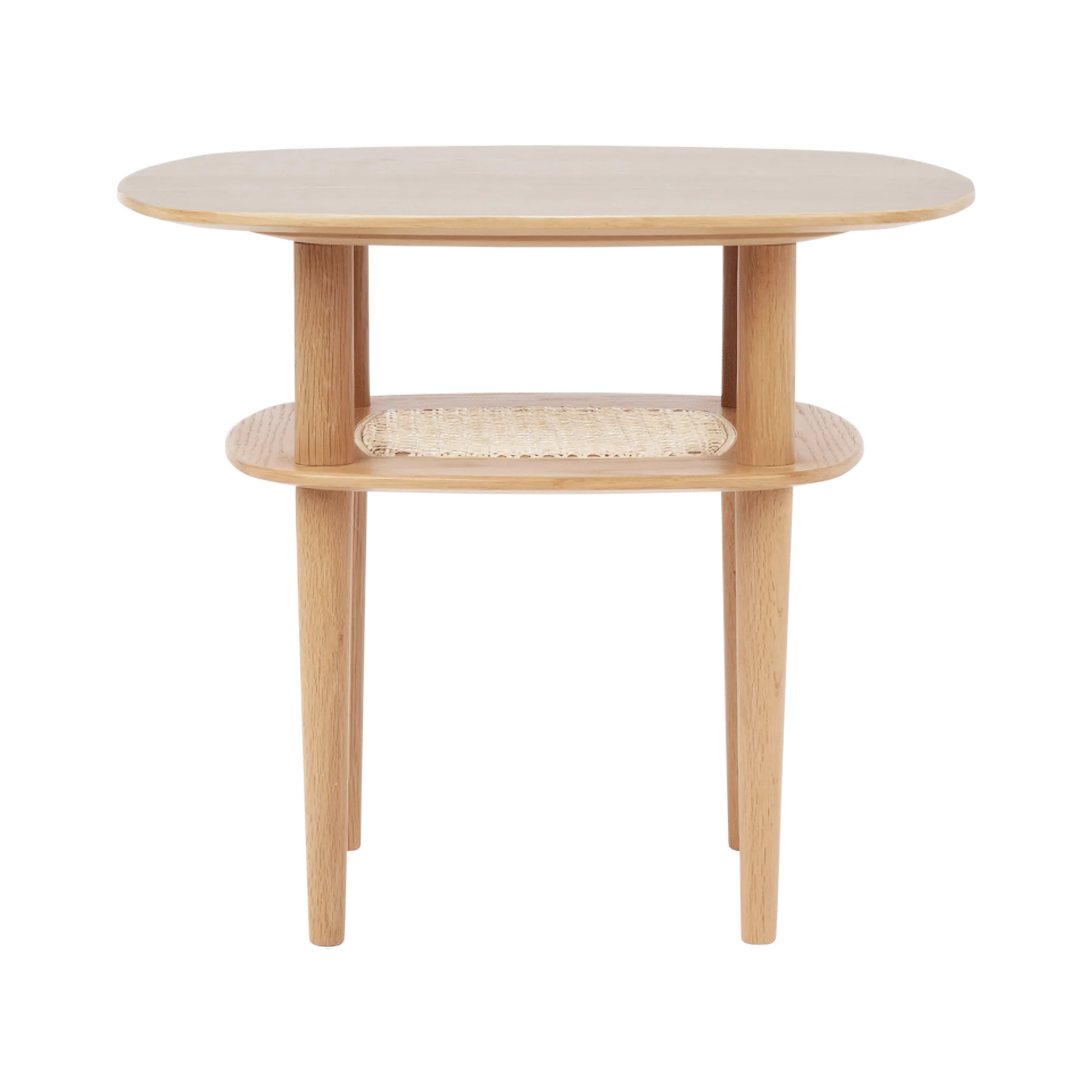 Together sofabord 60*60 cm er produsert i eik, med en hylle i rotting som gir et lett og luftig preg til designet. De avrundede hjørnene på bordet legger til et eksklusivitet uttrykk til designet. Bordets ben er trukket inn fra kanten av bordplaten - for sikkerheten til barn og tærne dine.
