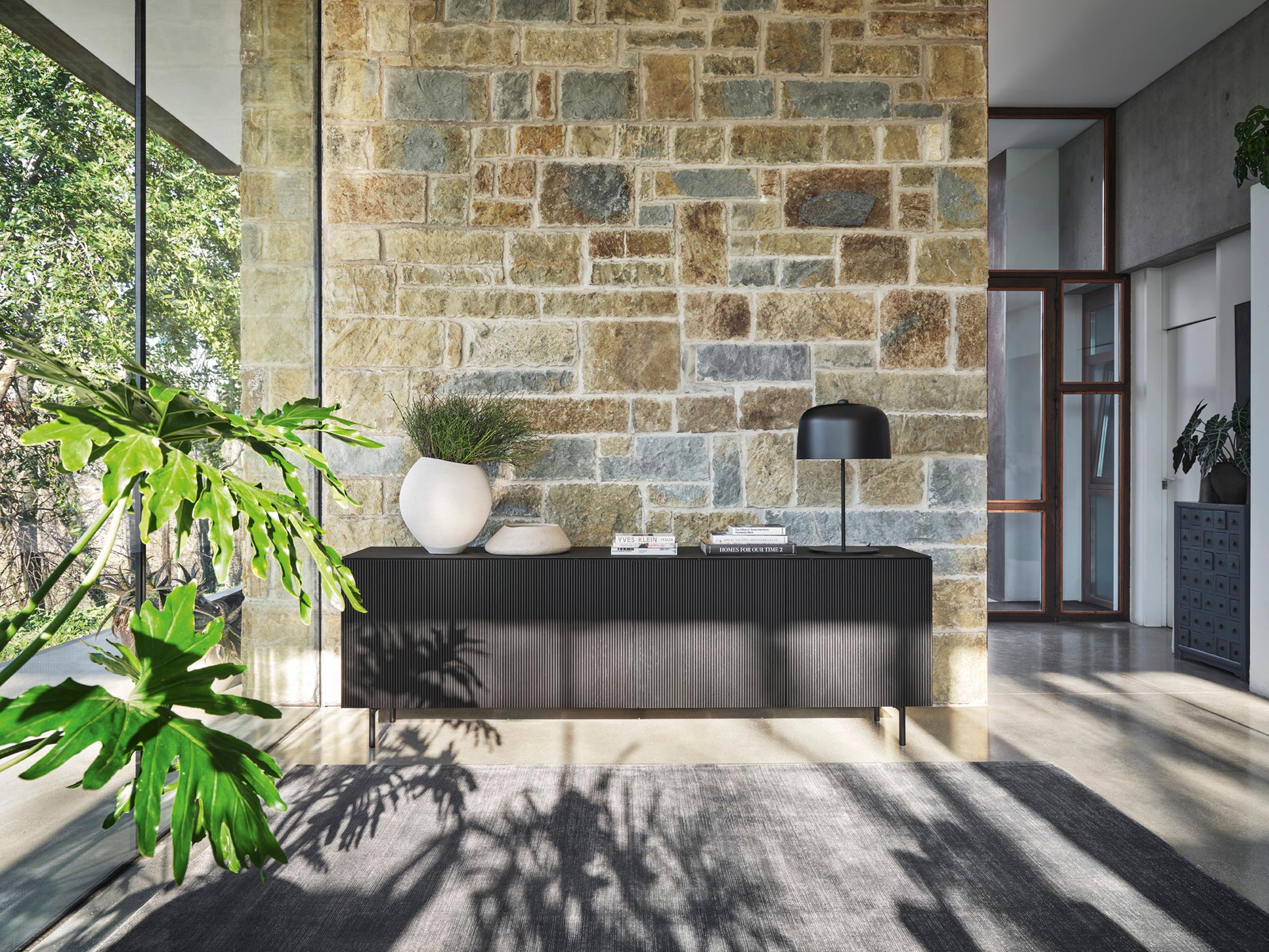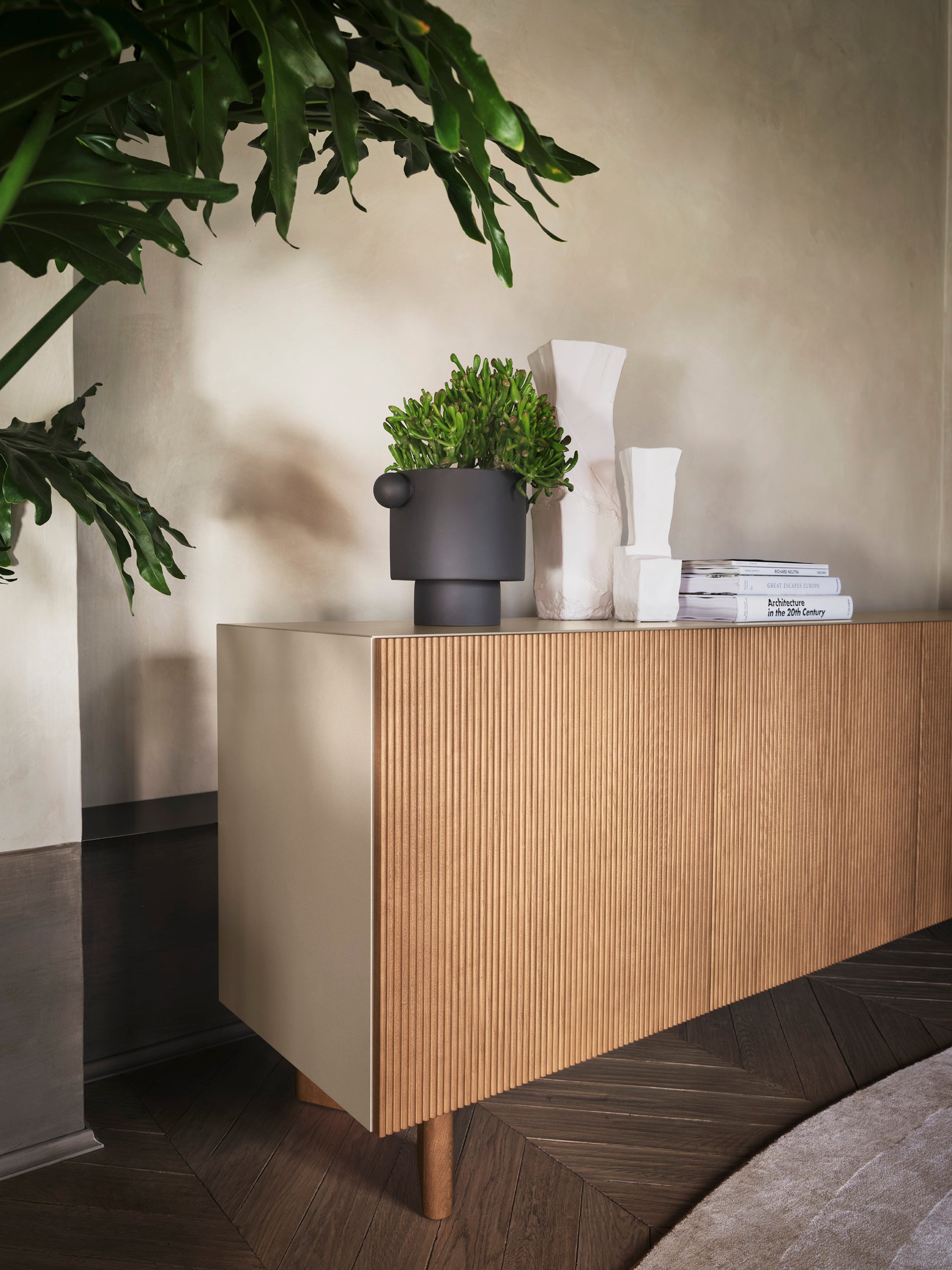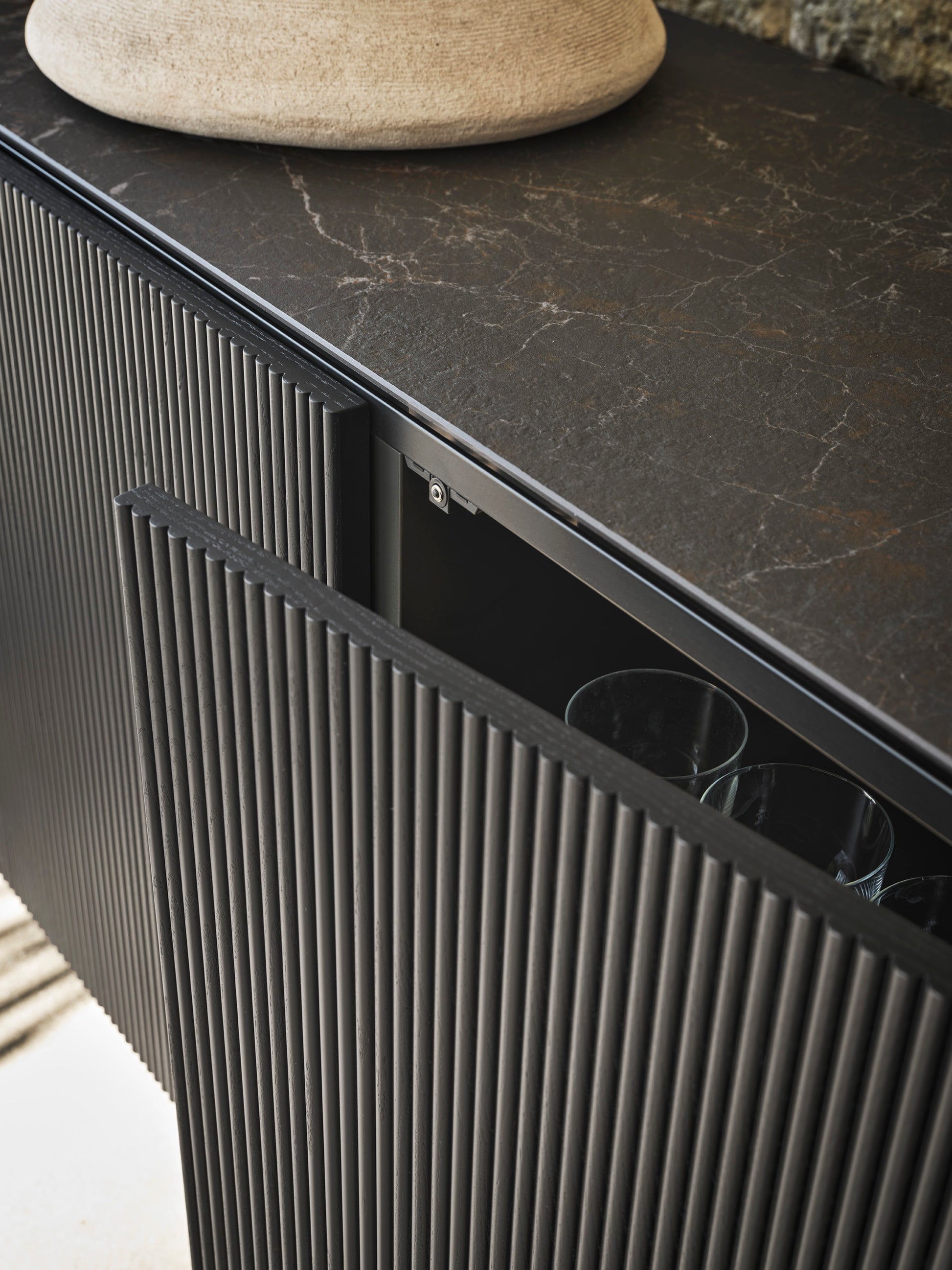 Vertical er en serie oppbevaringsmøbler og i klassisk sjenk utgave kommer den i 2 størrelser. 181 cm med 3 dører eller 240 cm med 4 dører. Dette er versjonen med de særegne spile dører i tre canaletto valnøtt eller mattsort lakkert,.